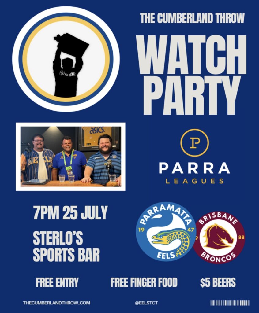 Don’t forget that you can join The Cumberland Throw in Sterlo’s Sports Bar this Friday night to watch the Eels battle with the Broncos on the big screen.