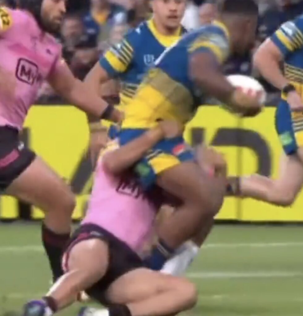 The Foxx is clearly tackled mid air. Somehow, someway, it was missed live and then in review. How? With thanks to Eels supporter Sean for grabbing this photo from the broadcast.