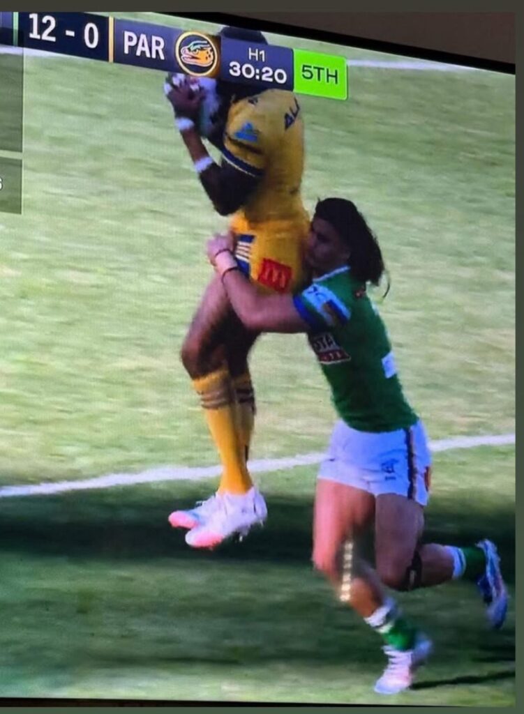 The Foxx takes control of the catch by leaping higher than the defender who clearly tackles the Eels winger mid air to prevent him from grounding the ball. Is that not a penalty try? At least a professional foul? No. Nothing seen by Klein or even worse, by Kasey Badger in review. How? How is that possible?