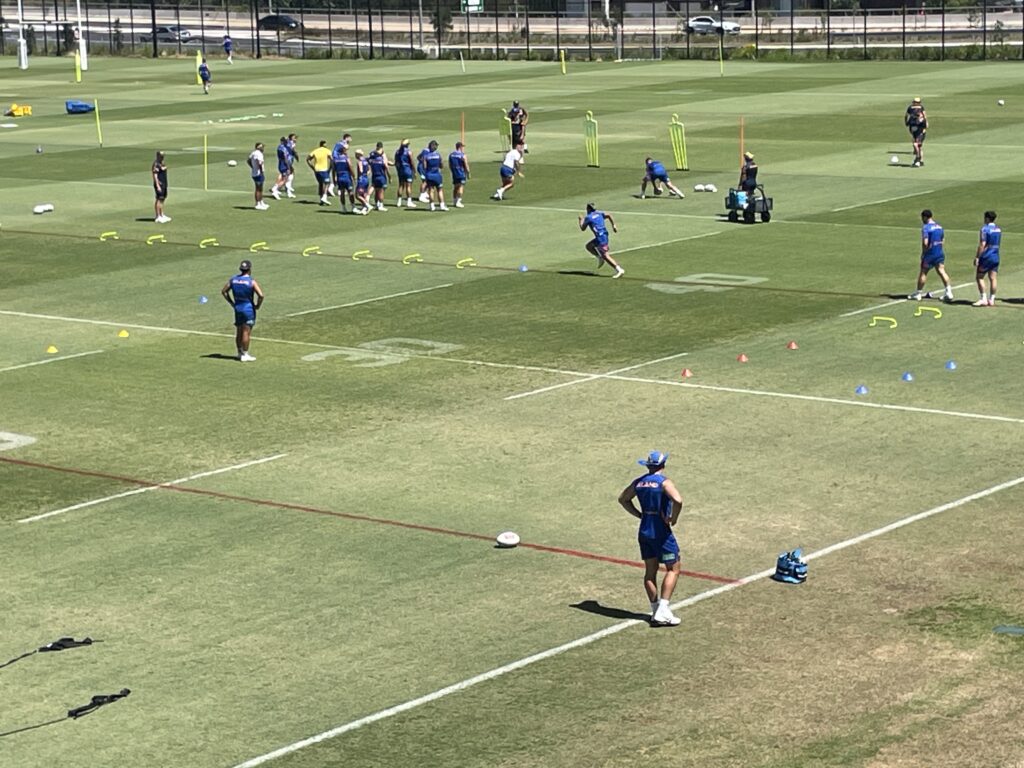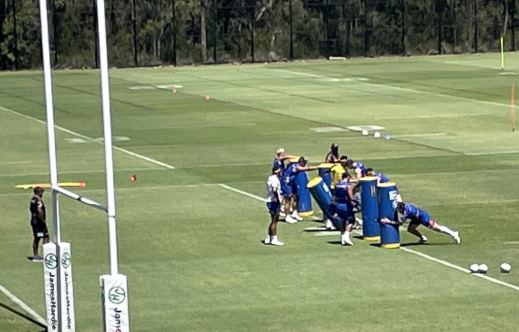 * All Players – Games of 7 on 6 and 4 on 2. It looked like the games of 6 on 7 allowed the players opportunities to huddle for team talks. These games were reminiscent of the games used for conditioning last season, and the players had to put in big time if they were one of two defenders that had to sprint around a corner marker before joining the defence line. I noted Araz Nanva sprinting away from defenders in the 7 on 6 game, and Sam Tuivaiti showing lightning reflexes to quickly chase and catch Ryley Smith after the Eels rake had grabbed an intercept.