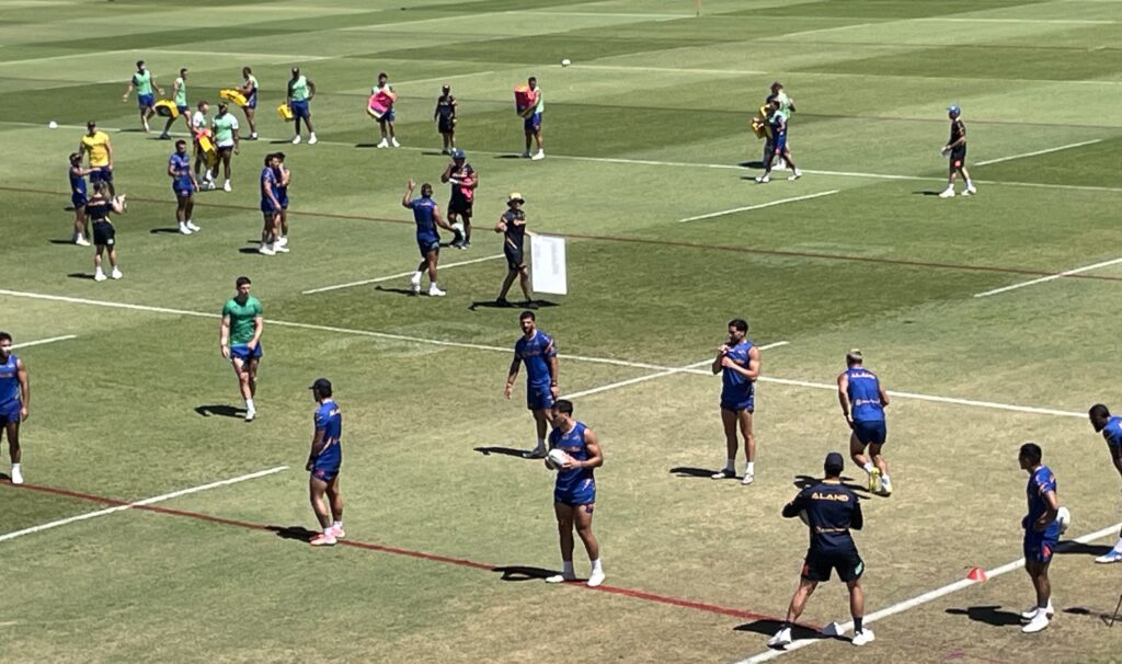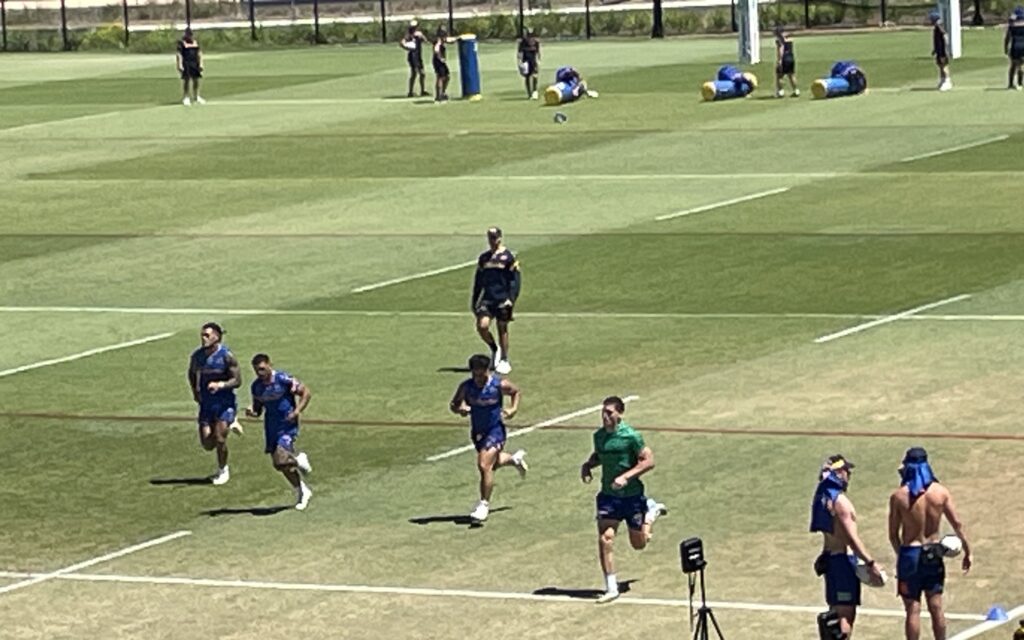Simultaneous games of eight on five and seven on four touch were played between the sets of circuit runs. I noted some big defensive chases and efforts from Charlie Guymer and Sean Russell. Maybe it was the different shirts that caused me to notice them, but they are wearing those shirts for a reason, and to my way of thinking, I reckon wearing the shirts would further motivate them.