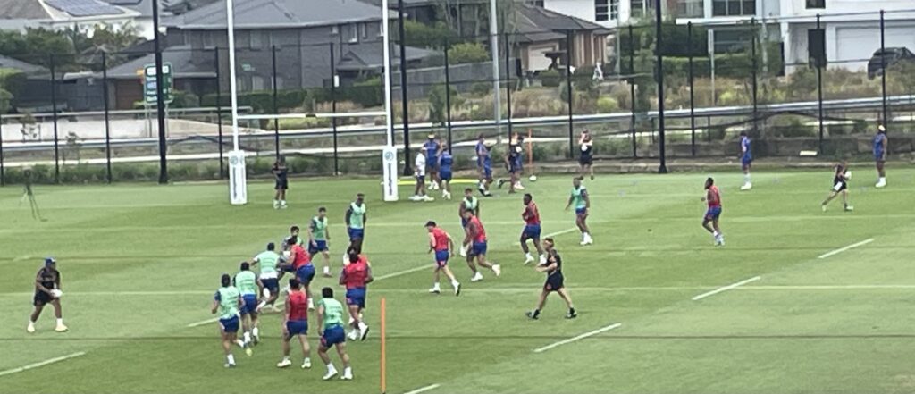 After today’s warm ups and running mechanics, it was football, football and even more football. Some of it was 13 on 13, some was left side vs right side. There was also rapid play through the ruck and edges against defenders with bump pads and micro work of 4 vs 2 vs 2 (two pairs of staggered defenders) and eight on eight.