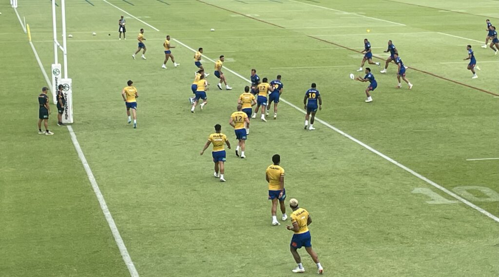 The scrimmages weren’t the only football component today, as opposed work without NRL ref supervision filled the spaces before, between and after the scrimmages. That work mostly focussed on transitioning from kicks but it also including red zone attack and defence.